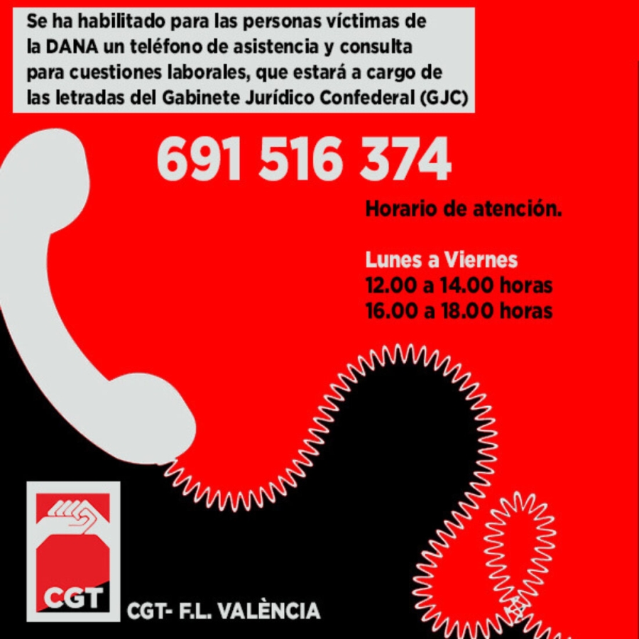 Desde el Comité Confederal de la CGT y junto a las compañeras de la Federación Local de València, se ha puesto a disposición de las personas afectadas por la DANA del pasado 29 de octubre un número telefónico para resolver dudas y atender consultas de índole laboral.