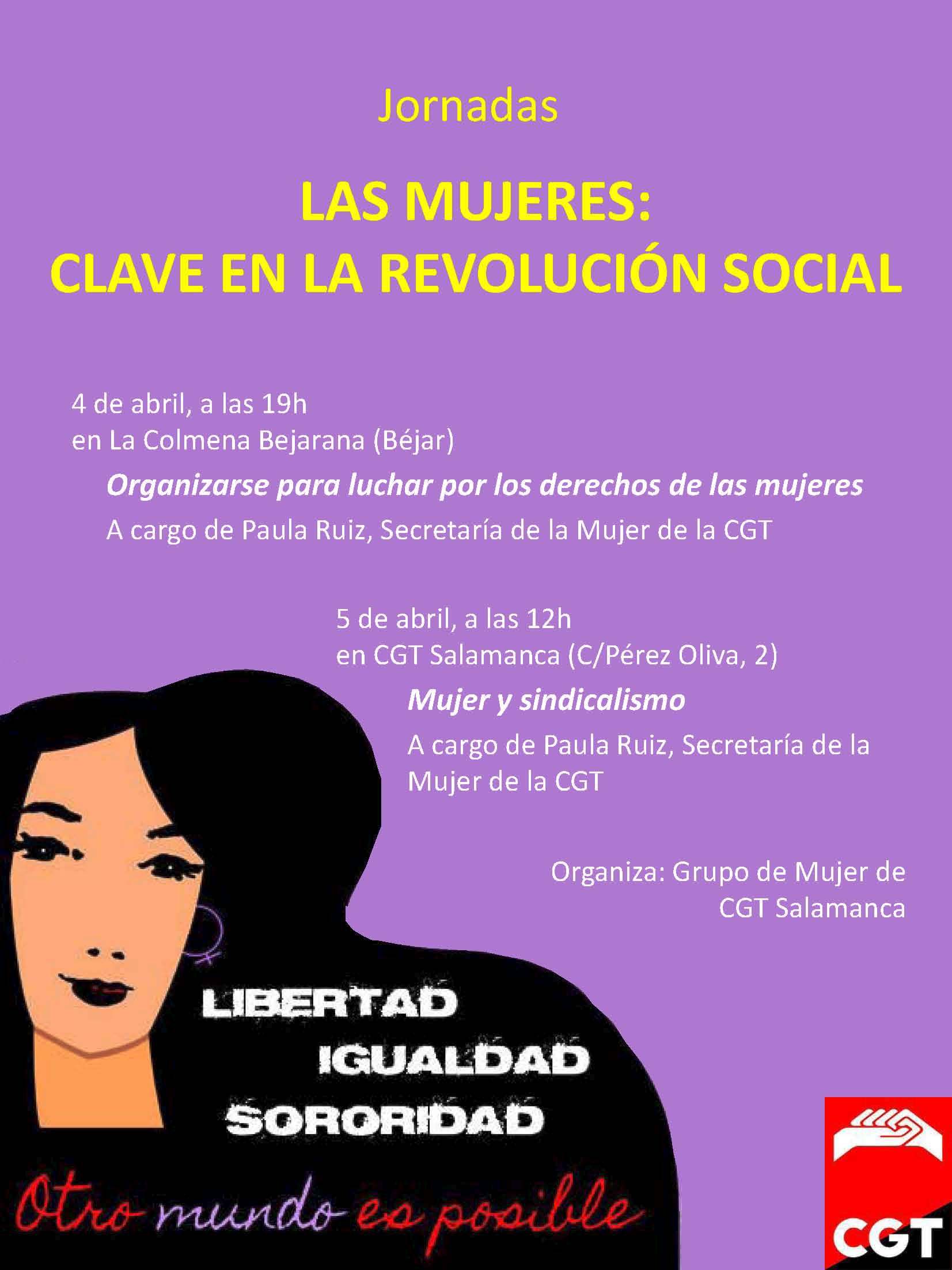 El grupo de mujer de CGT Salamanca ha concluido en junio las Jornadas tituladas: LAS MUJERES: CLAVE EN LA REVOLUCIÓN SOCIAL, y nos gustaría hacer un breve resumen y comentario de lo que han significado y supuesto para nosotras estas actividades.